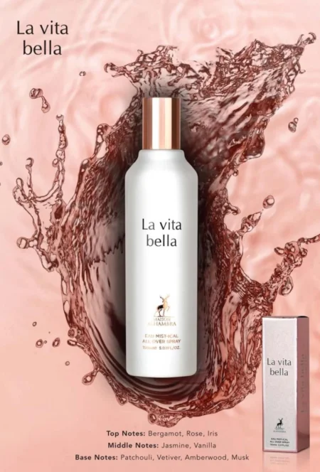 La Vita Bella é uma fragrância radiante e encantadora, ideal para quem deseja exalar otimismo e charme em cada movimento. A saída mistura a vivacidade da bergamota com a delicadeza da rosa e da íris, resultando em um início floral e fresco. No coração, o jasmim se funde com a suavidade da baunilha, criando uma harmonia envolvente e acolhedora. A base traz um toque quente e sofisticado com patchouli, vetiver, âmbar e musk, garantindo durabilidade e presença. Um perfume em spray para cabelo que traduz beleza, alegria e feminilidade.
